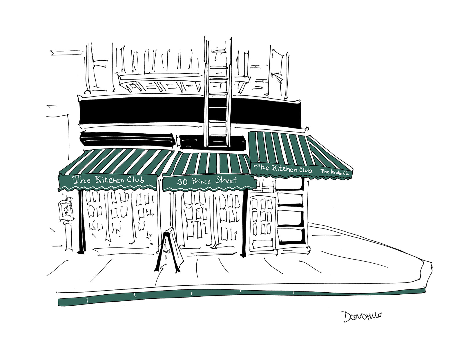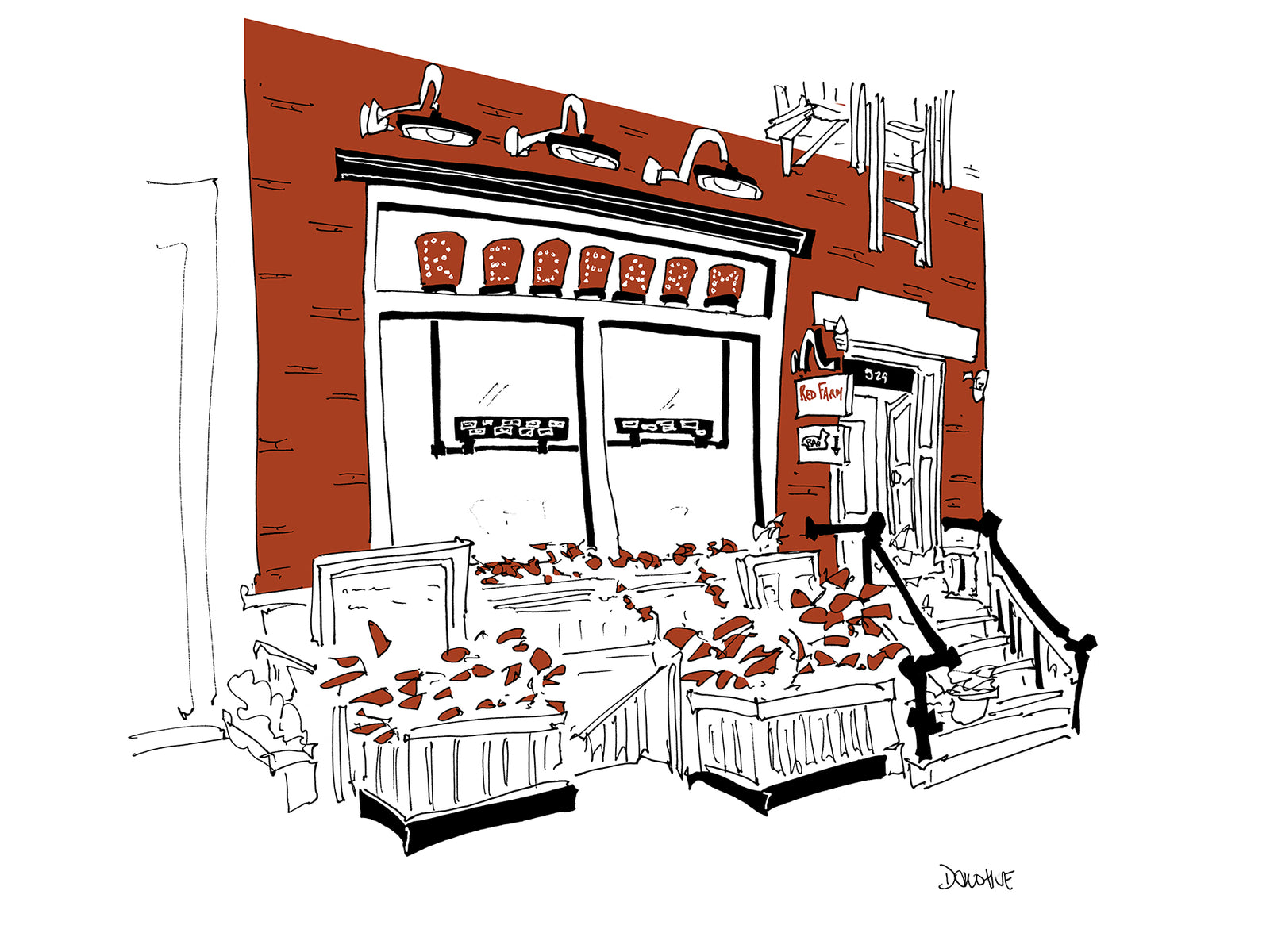 I roam the streets with my pen and paper, sketching the facades of beloved restaurants. Drawing in ink with no corrections and finishing the image with a single color, I create one-of-a-kind works that evoke fond memories of cherished meals together.